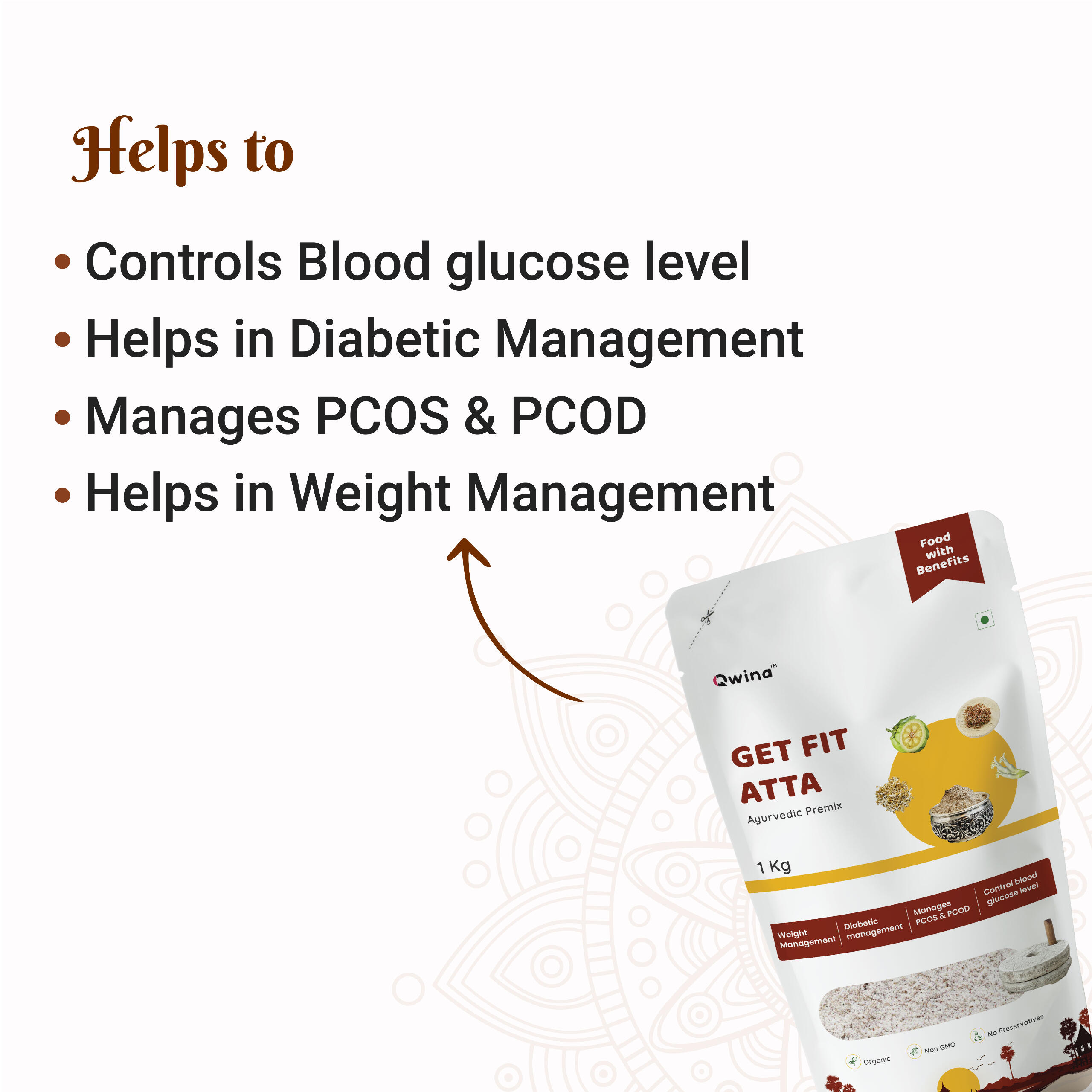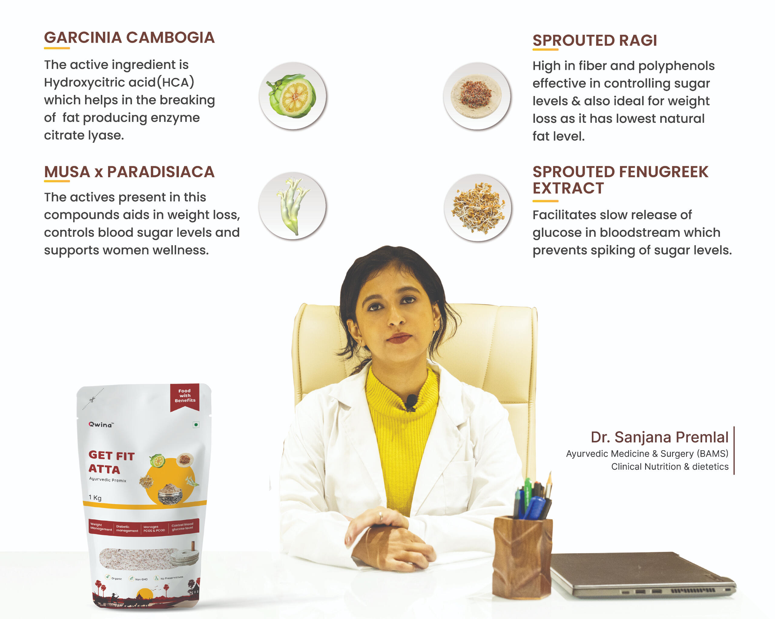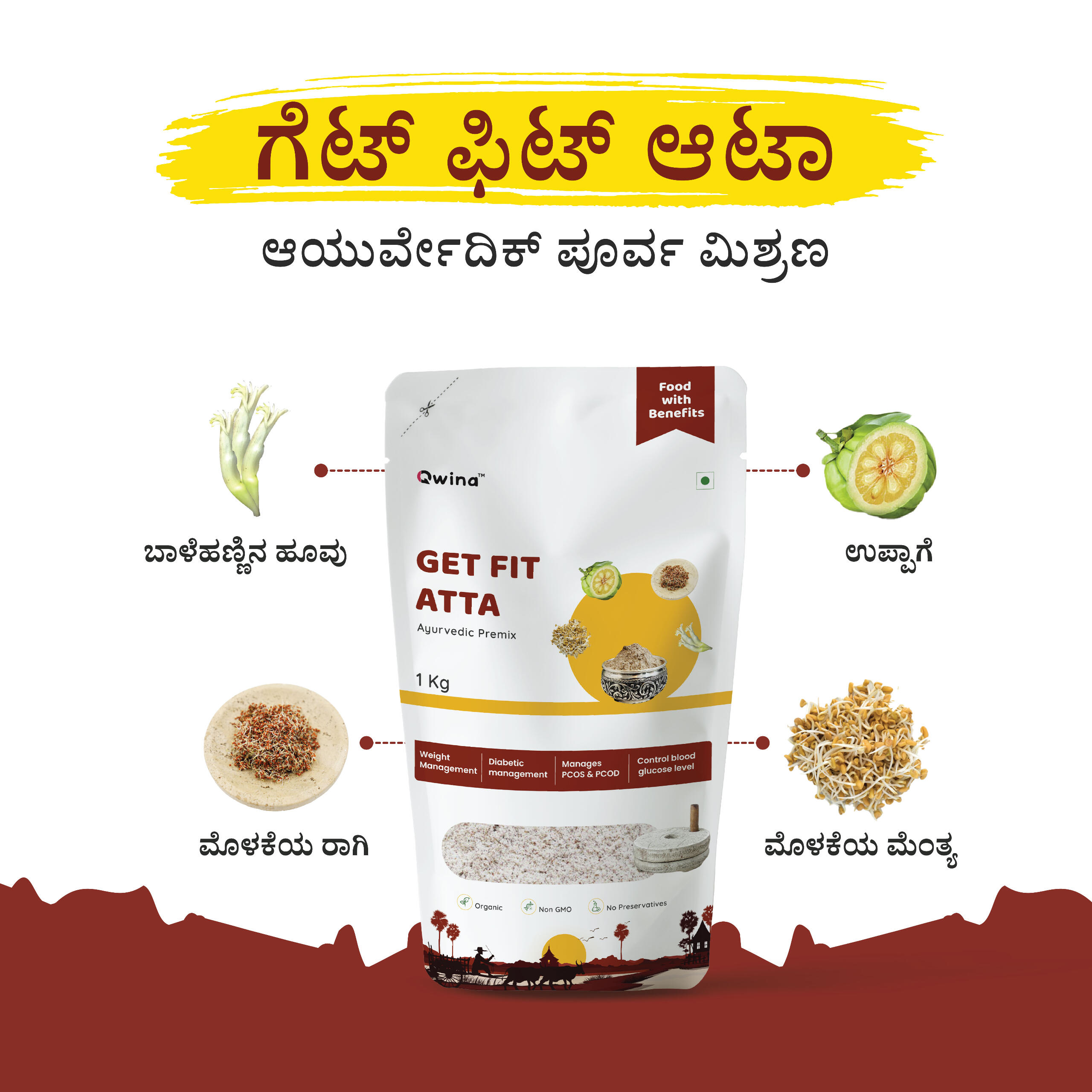 ಗೆಟ್ ಫಿಟ್ ಅಟ್ಟಾ ಎಂಬುದು ವೈಜ್ಞಾನಿಕವಾಗಿ ರಚಿಸಲಾದ ಪ್ರಿಮಿಕ್ಸ್ ಆಗಿದ್ದು, ಬಾಳೆ ಹೂವು, ಗಾರ್ಸಿನಿಯಾ ಕಾಂಬೋಜಿಯಾದ ನ್ಯೂಟ್ರಾಸ್ಯುಟಿಕಲ್ ಸಾರದೊಂದಿಗೆ, ರಾಗಿ ಮತ್ತು ಮೊಳಕೆಯೊಡೆದ ಮೆಂತ್ಯದ ಸಂಯೋಜನೆಯೊಂದಿಗೆ ತಯಾರಿಸಲಾಗಿದೆ.