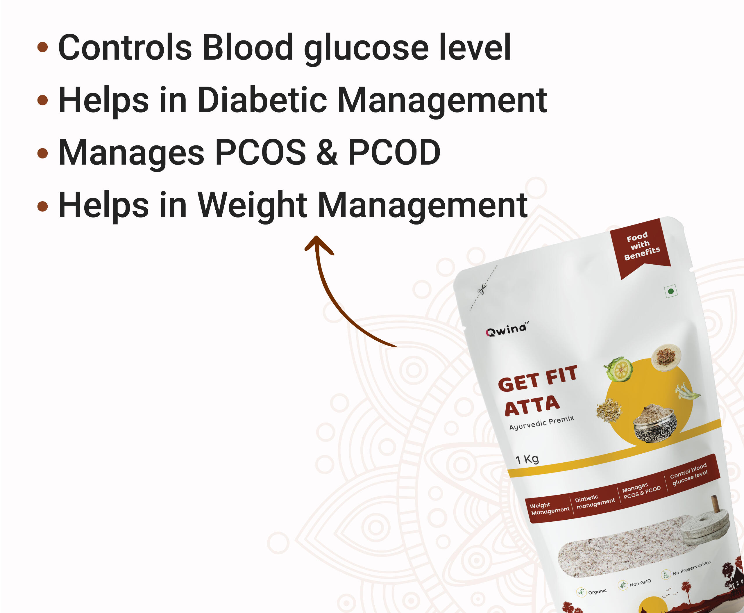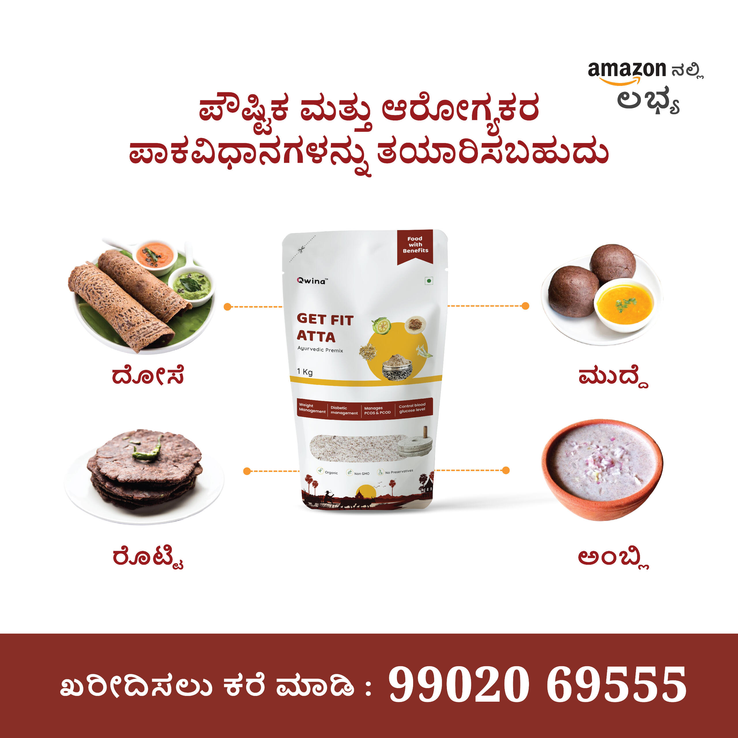 ಗೆಟ್ ಫಿಟ್ ಅಟ್ಟಾ ಎಂಬುದು ವೈಜ್ಞಾನಿಕವಾಗಿ ರಚಿಸಲಾದ ಪ್ರಿಮಿಕ್ಸ್ ಆಗಿದ್ದು, ಬಾಳೆ ಹೂವು, ಗಾರ್ಸಿನಿಯಾ ಕಾಂಬೋಜಿಯಾದ ನ್ಯೂಟ್ರಾಸ್ಯುಟಿಕಲ್ ಸಾರದೊಂದಿಗೆ, ರಾಗಿ ಮತ್ತು ಮೊಳಕೆಯೊಡೆದ ಮೆಂತ್ಯದ ಸಂಯೋಜನೆಯೊಂದಿಗೆ ತಯಾರಿಸಲಾಗಿದೆ.